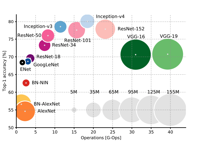 - Architectures in a particular cluster, such as GoogleNet, ResNet-18 and ENet, are very attractive since they have small footprints (both memory and time) as well as pretty good accuracies. Because of low-memory footprints, they can be used on mobile devices, and because the number of operations is small, they can also be used in real time inference.