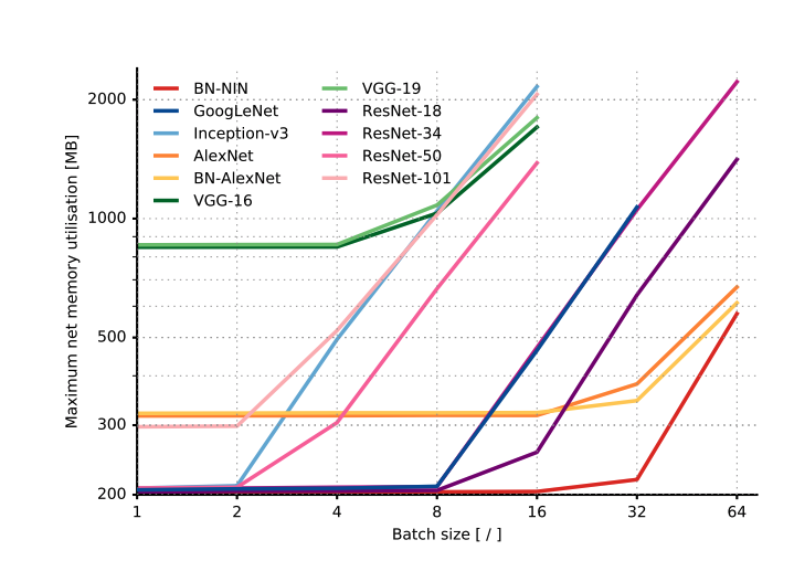 - Up to a certain batch size, most architectures use a constant memory, after which the consumption increases linearly with the batch size.